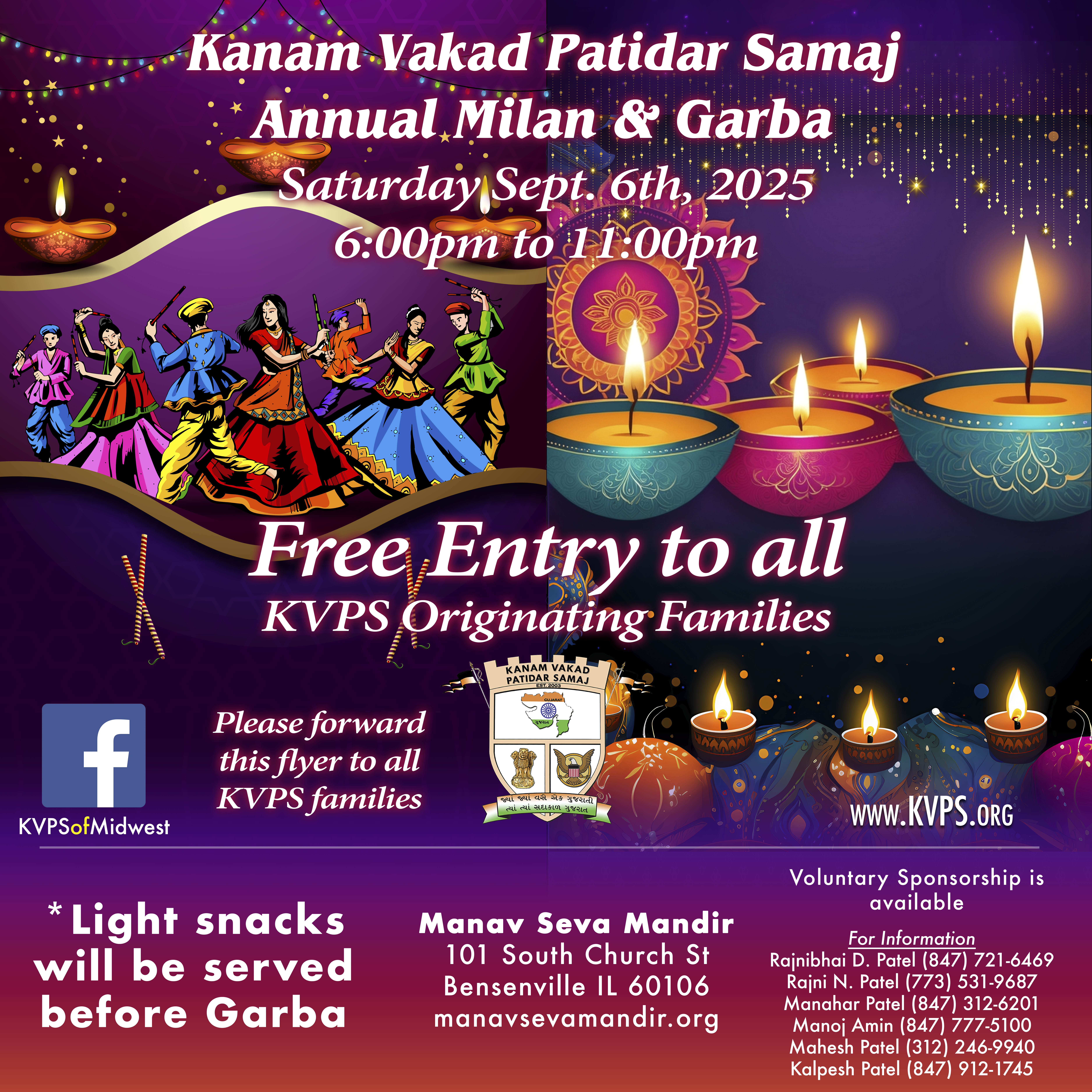 | Garba & Diwali Celebration | Saturday Sept. 6, 2025 | Starts 6:30pm | Manav Seva Mandir 101 S Church St Bensenville, IL 60106 |